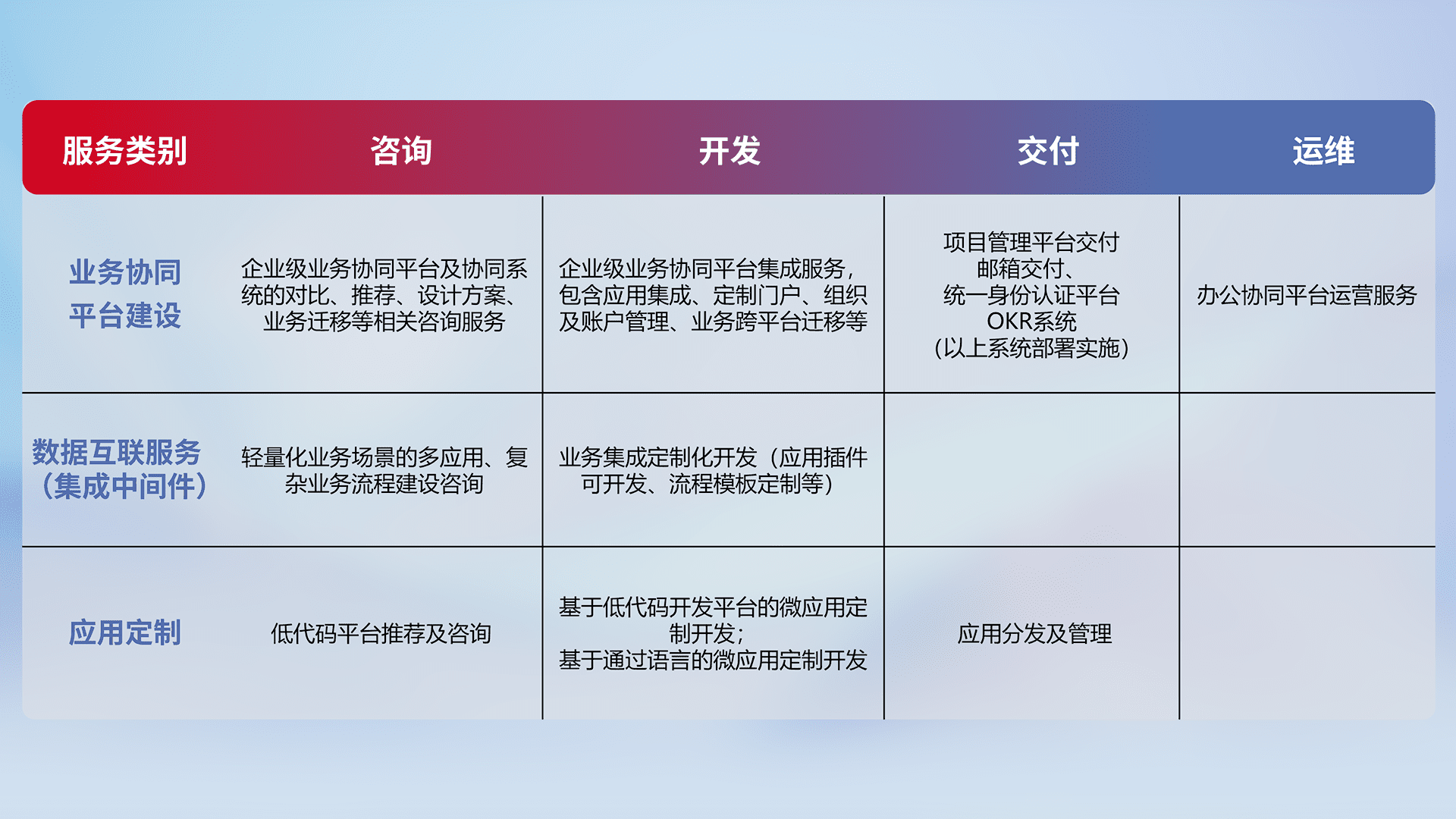 针对钉钉、、、企微、、、、IDaas等平台级产品提供产品的规划、、方案、、交付、、定制化开发等服务,,,,实现如统一协同办公、、、、智能客户服务、、、混合会议管理、、智能数据查询、、等业务场景,,,,实现数字化转型。。。