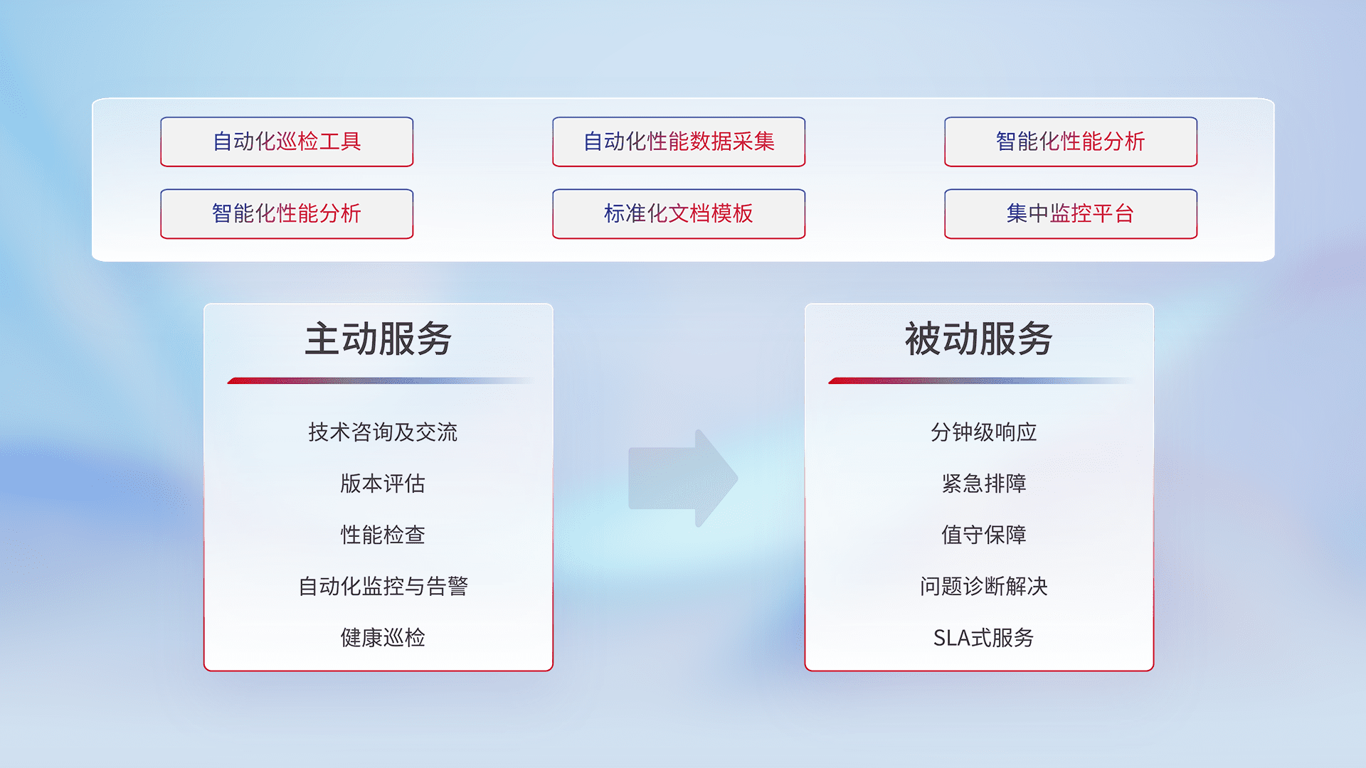 智能化工具和标准化文档,,保障服务质量,,,,提供主动服务(包含技术咨询、、版本评估、、、性能检查、、、、自动化监控与告警、、、健康巡检)和被动服务包含(分钟级响应、、、、紧急排障、、、、值守保障、、问题诊断解决、、SLA服务)。。。